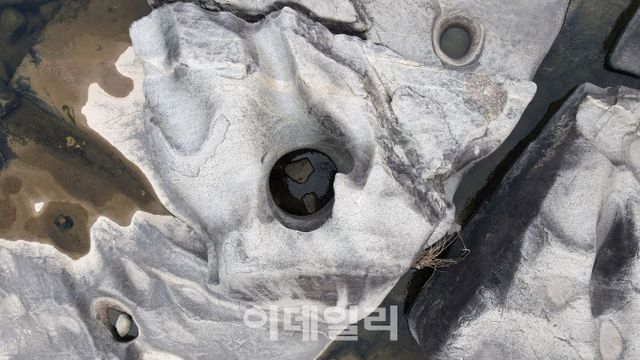 | 전북 순창 섬진강 여행의 시작점인 장군목에 있는 요강바위의 모습. 절구통처럼 속이 매끈하게 깎이고 파여있다. |