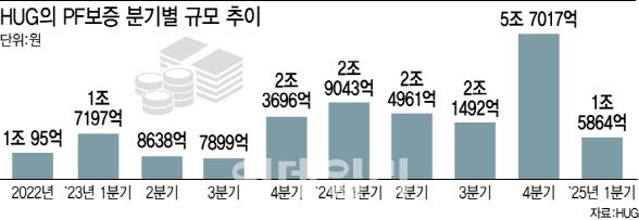 HUG의 PF보증 규모는 2023년까지만 해도 연간 5조 7000억원이었으나 2024년엔 13조 3000억원으로 두 배 이상 급증했다. 올 1분기에도 1조 6000억원 가량의 PF보증이 취급됐다. 이는 HUG가 보증 요건을 지속적으로 완화한 영향이 크다.