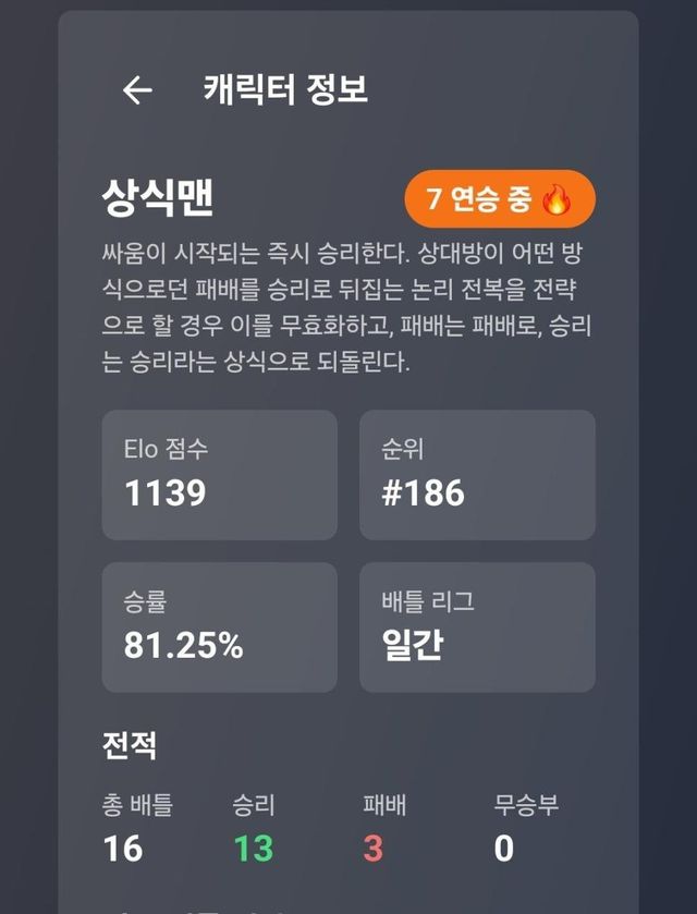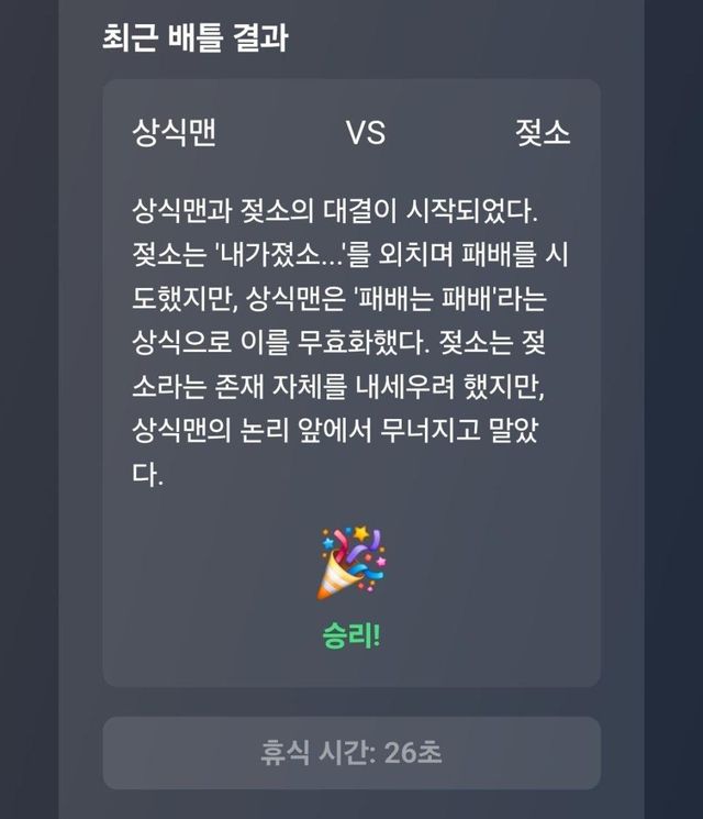 한가지만 바라는 점이 있다면대전한 상대의 캐릭터 설정도 읽어보고 싶음 ㅋㅋㅋ