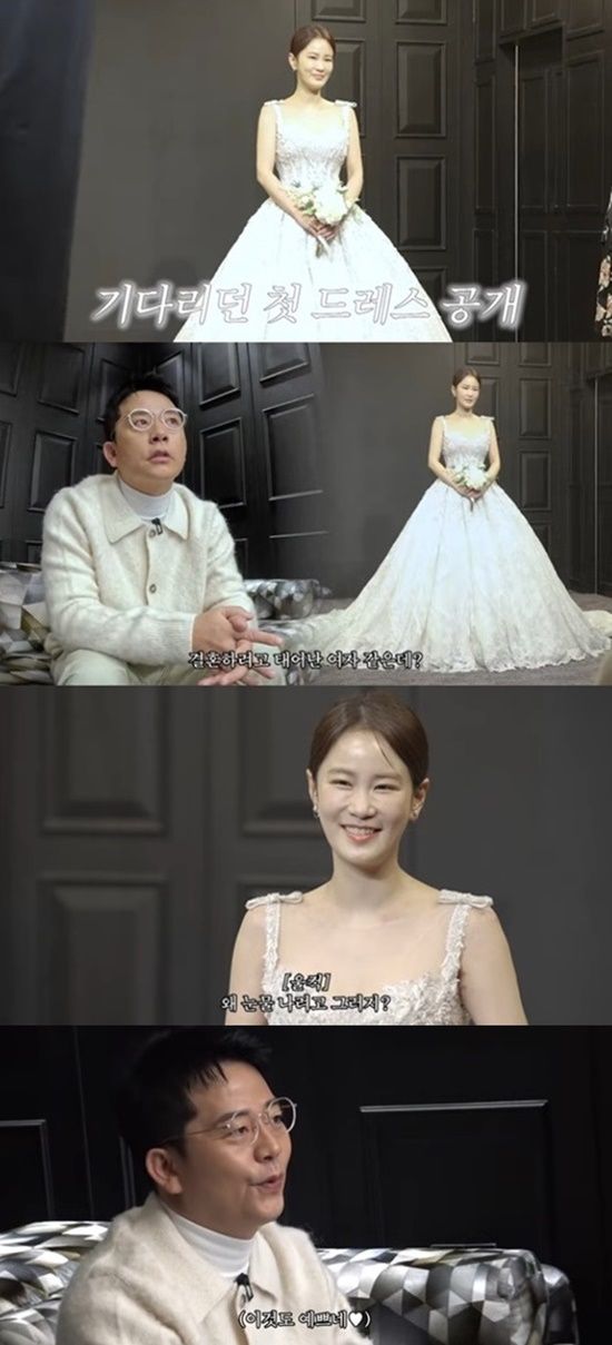 김지민은 "왜 눈물이 나려고 그러지"라며 울컥했고, "드레스를 많이 입어봤지만, 내 웨딩드레스는 처음이다"라고 고백했다.
