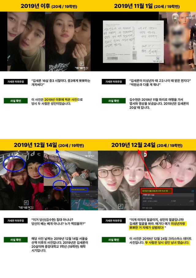2019년 김수현도, 김새론도 각자 애인이 있었다는 주장. 2019년 김새론의 키스영상이라고 주장하는 자료도 공개했다. 김수현 측은 김새론과 2019년 여름부터 2020년 가을까지 교제했다고 밝힌 바 있다. 이에 더해 소속사 측은 2019년 김수현, 김새론 볼뽀뽀 사진, 파리 엽서, 김새론 수면 사진 등에 대해 "두 사람은 당시 성인"이라고 밝히며 해명한 바 있다.