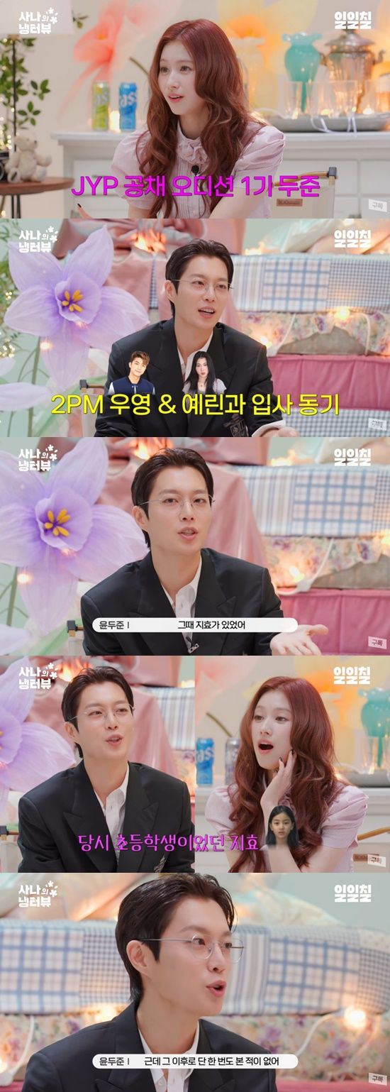 이날 사나는 "내가 엄청난 얘기를 들었다. 오빠가 내 대선배더라"면서 "JYP 공채 오디션 1기라면서?"라고 입을 열었다.