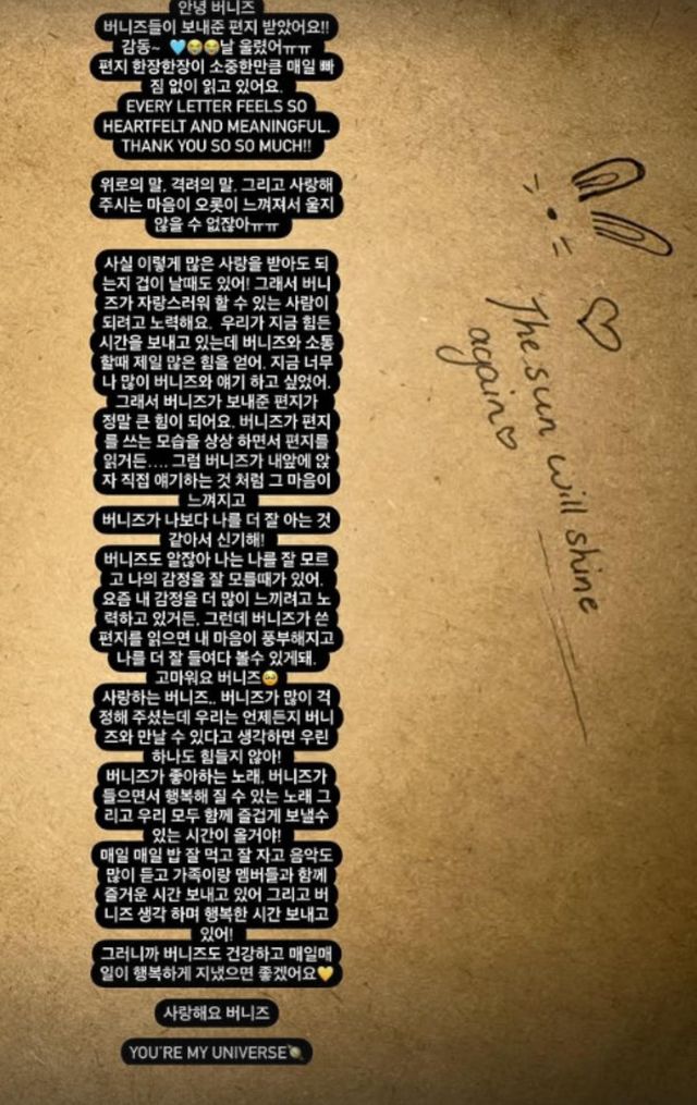 이어 "위로의 말, 격려의 말 그리고 사랑해 주시는 마음이 오롯이 느껴져서 울지 않을 수가 없었다"며 "이렇게 많은 사랑을 받아도 되는지 겁이 날 때도 있다. 그래서 버니즈가 자랑스러워 할 수 있는 사람이 되려고 노력한다"고 전했다.