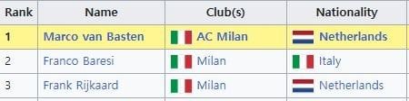 1989년 AC밀란 1위 반 바스텐 / 2위 프랑코 바레시 / 3위 프랑크 레이카르트