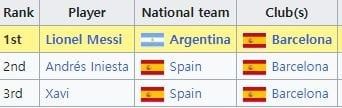 2010년 FC 바르셀로나 1위 리오넬 메시 / 2위 안드레스 이니에스타 / 3위 사비 에르난데스