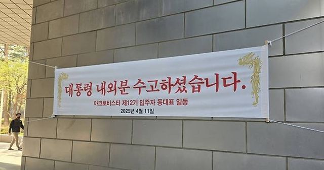 연합뉴스에 따르면 이날 오전 아크로비스타 내부에는 입주자 동대표 일동 명의로 '대통령 내외분 수고하셨습니다'라고 적힌 현수막이 내걸렸다.