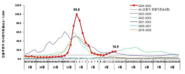 14주차(3월30~4월5일) 38도 이상의 발열과 함께 기침, 인후통이 있어 의원급 의료기관을 찾은 인플루엔자 의사환자수는 외래환자 1000명당 16.9명으로 집계됐다. 10주 8.0명 → 11주 10.8명 → 12주 13.2명 → 13주 16.3명 → 14주 16.9명 등 3월 이후 4주 연속 증가세다. 이번 절기 유행기준(8.6명)보다 높은 수준으로 유행이 지속되고 있다.