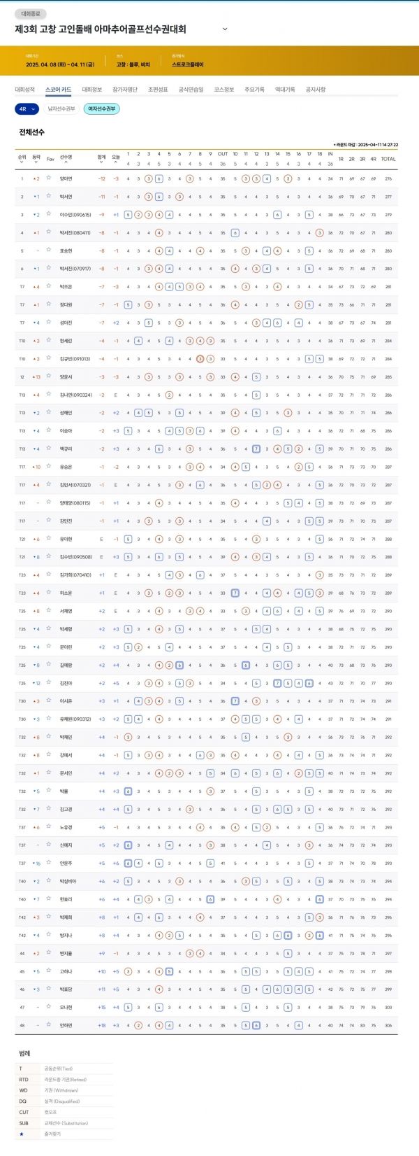 -컷오프 : 2025년(남자 3오버파 147타 48명, 여자 4오버파 148타 49명) 2024년(남자 1오버파 145타 48명, 여자 3오버파 147타 48명)