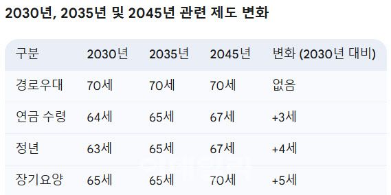 2026년부터 2030년까지를 1단계로 보고 이 때, 지하철 무임승차, 철도 할인 등 경로우대 혜택 기준을 매년 1세씩 높여 65세에서 70세로 조정하는 등 노년 기준 상향의 신호를 사회에 알리는 방안을 적용해야 한다고 했다. 또 지방자치단체 조례 개정을 통해 공원, 박물관 등 무료입장 기준도 순차 상향하고, 노인복지법을 개정해 공식적으로 ‘노인은 70세 이상’으로 선언하는 게 필요하다고 부연했다.