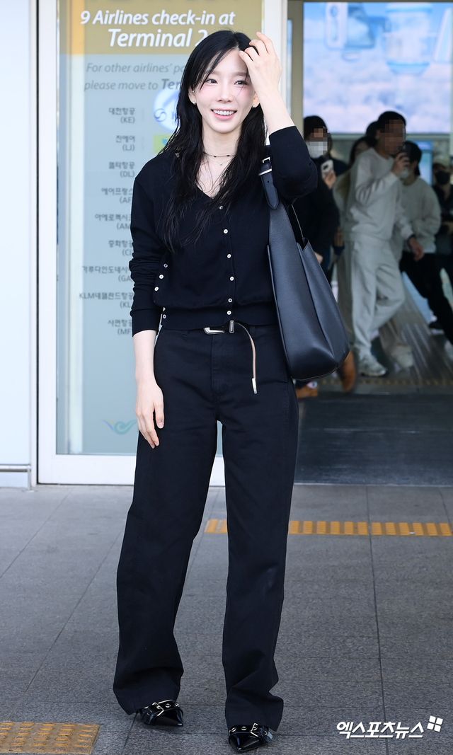 11일 오후 해외 일정 참석 차 인천국제공항에 모습을 드러낸 태연은 블랙으로 통일한 심플한 공항 패션으로 시선을 사로잡았다. 버튼 디테일이 들어간 블랙 카디건에 같은 톤의 와이드 팬츠를 매치해 깔끔하면서도 시크한 분위기를 연출했다.