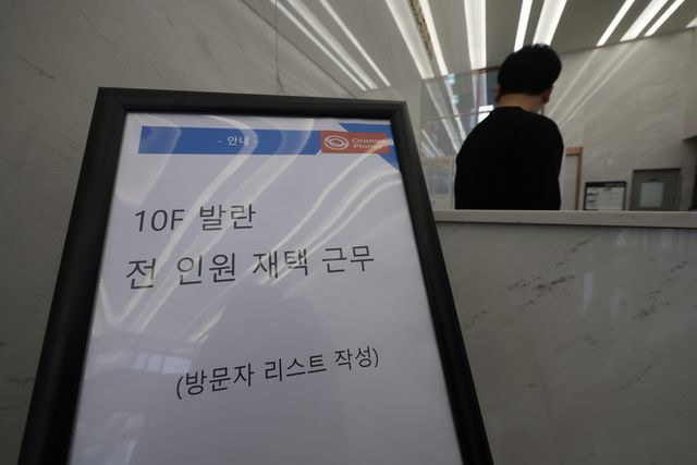 명품 온라인플랫폼 발란이 서울회생법원에 기업회생절차(법정관리)를 신청한 가운데 지난 1일 서울 강남구 발란 본사가 있는 공유오피스 로비에 '발란 전 인원 재택근무'라고 적힌 안내문이 놓여있다. ⓒ 연합뉴스