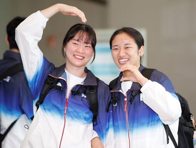 배드민턴 국가대표 김가은과 안세영(오른쪽)이 ’2024 파리 올림픽‘을 위해 지난해 7월 12일 인천국제공항을 통해 프랑스 파리로 출국하기 전 인사를 하고 있다. / 뉴스1