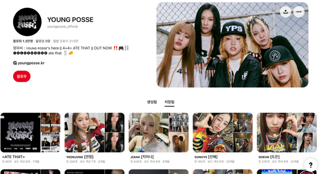 '국힙 걸그룹' 영파씨도 핀터레스트를 적극적으로 활용 중입니다. 이들은 링크 첨부 기능을 통해 각종 소셜미디어에 흩어져 있던 사진들을 한곳에 모아 보여주고 있는데요. 멤버별로 이미지가 정리되어 있어, 갓 입덕한 팬이라면 핀터레스트를 먼저 방문하는 걸 추천! 보기 편하게 정리된 피드는 물론, 스타일과 분위기까지 느껴지는 아카이빙이 인상적입니다.