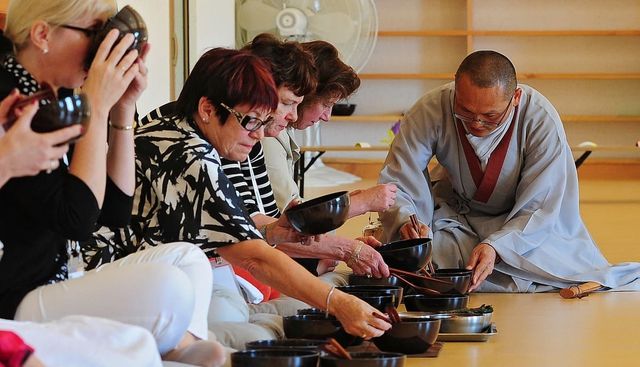 대구세계에너지총회 참가자와 가족들이 2013 대구 동화사 국제선수련관 참선당에 방문해 발우공양 체험을 하고 있다. / 뉴스1