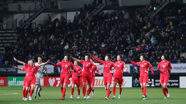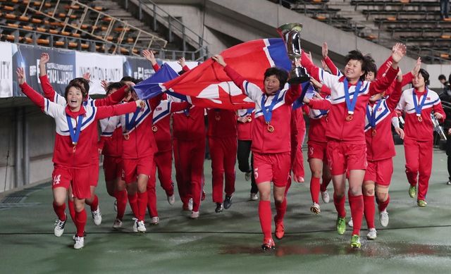 2017 동아시안컵(EAFF E-1 풋볼 챔피언십) 북한과 일본의 여자 축구경기에서 2-0으로 승리한 북한 선수들이 기뻐하고 있다. 북한은 당시 대회 3전 전승으로 우승을 차지했다. / 뉴스1