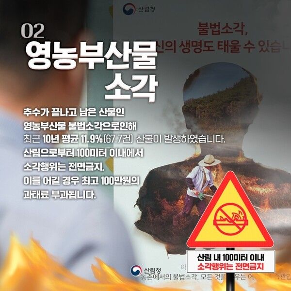 아울러, “사소한 부주의로 인해 발생한 산불이라도 산불원인 행위자는 산림보호법 제53조에 따라 3년 이하의 징역 또는 3천만원 이하의 벌금에 처해질 수 있다.”고 말했다.