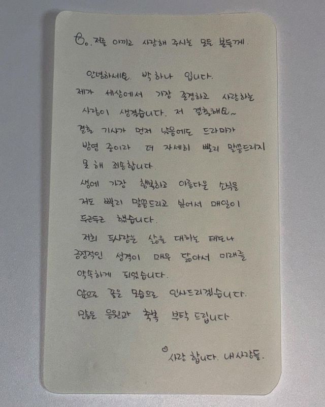 이어 "결혼 기사가 먼저 났음에도 드라마가 방영 중이라 더 자세히 빨리 말씀드리지 못해 죄송하다. 생에 가장 행복하고 아름다운 소식을 저도 빨리 말씀드리고 싶어서 매일이 두근두근 했다"며 뒤늦게 알린 것에 미안한 마음을 전했다.