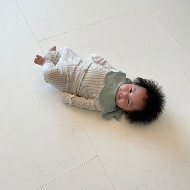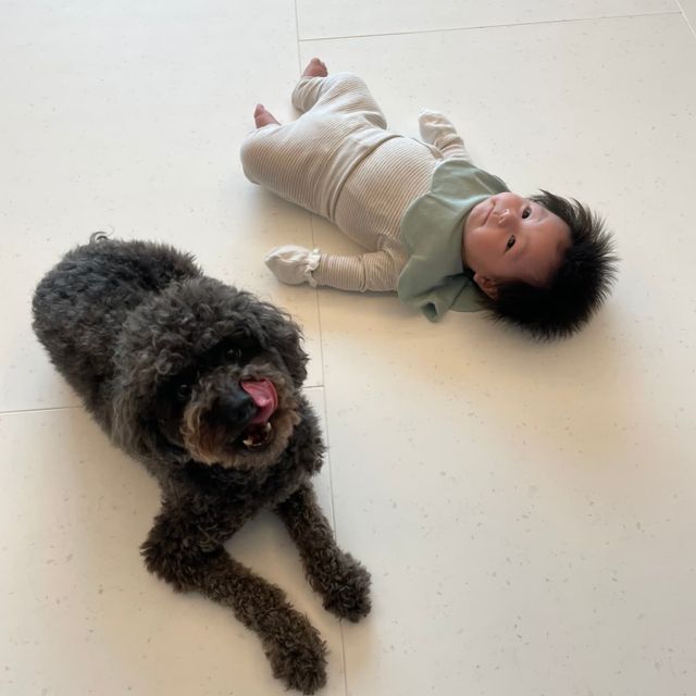 사진 속에는 새로 시공한 매트 위에 누워 있는 하루 군의 모습이 담겨 있다. 신생아라고 믿기지 않는 빽빽한 머리숱과 엄마 아빠를 쏙 빼닮은 이목구비가 귀엽고 사랑스럽다.