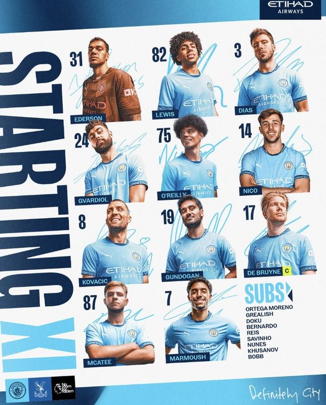 홈팀 맨시티는 4-2-3-1 포메이션을 가동했다. 골문을 에데르송이 지켰다. 백4 라인엔 리코 루이스, 요슈코 그바르디올, 니코 오라일리가 나섰다. 그 앞에 마테오 코바치치, 니코 곤살레스가 위치했다. 중원은 케빈 더 브라위너(KDB), 일카이 귄도안, 제임스 맥아티어로 짜여졌다. 오마르 마르무시가 원톱을 맡았다.