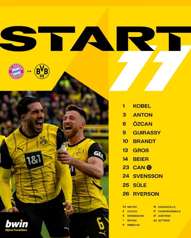원정팀 도르트문트는 3-4-1-2 전형으로 맞섰다. 그레고어 코벨이 골키퍼 장갑을 끼고, 발데마르 안톤, 엠레 잔, 니클라스 쥘레가 백3를 형성한다. 3선에서 다니엘 스벤손, 살리흐 외즈잔, 파스칼 그로스, 율리안 뤼에르손이 호흡을 맞추고, 2선은 율리안 브란트가 맡았다. 최전방에서 세루 기라시와 막시밀리안 바이어가 뮌헨 골문을 노린다.
