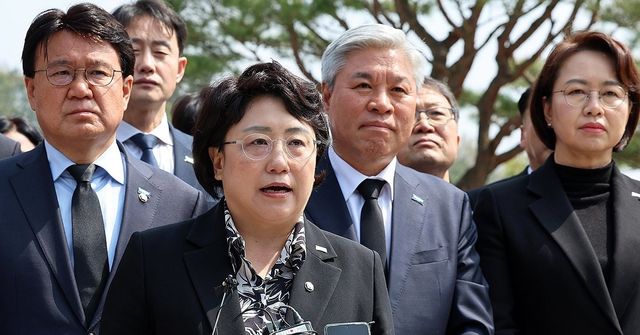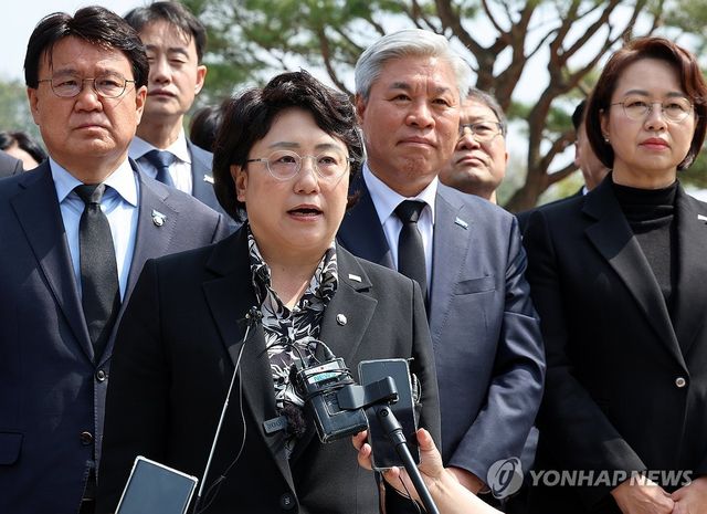 조국혁신당 김선민 대표 권한대행이 10일 오전 광주 북구 국립5·18민주묘지에서 발언하고 있다. / 연합뉴스