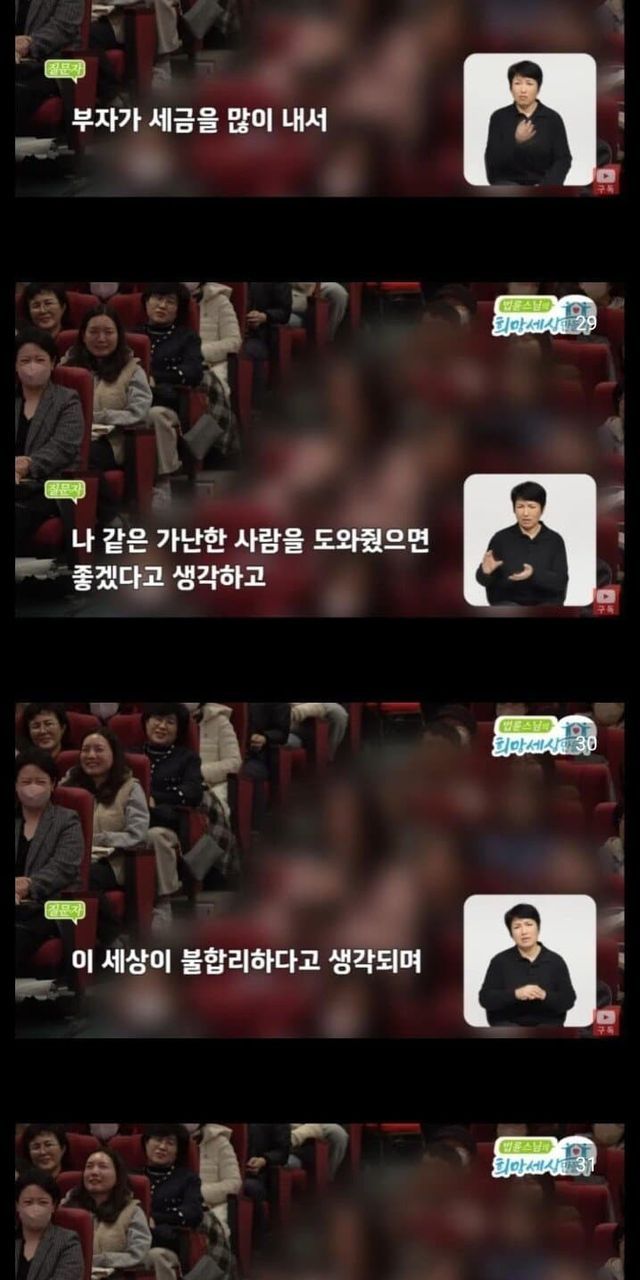 "부자가 세금 많이 내서 나 같은 가난한 사람 도와줬으면 좋겠다"