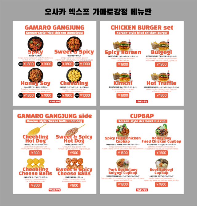 가마로강정은 매콤강정, 양념강정, 허니소이강정, 치블링강정 총 4가지 메뉴로 다양한 관람객들의 입맛을 사로잡을 메뉴를 구성했다. 또 수제치킨버거, 핫도그, 치즈볼과 새로 개발한 닭강정 컵밥인 가마로컵밥 메뉴를 최초로 선보인다.