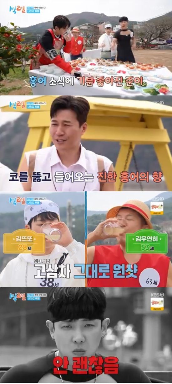 13일 방송된 KBS 2TV '1박 2일 시즌4'에서는 김종민, 문세윤, 조세호, 이준, 딘딘, 유선호가 경남 거제로 떠나는 모습이 전파를 탔다.