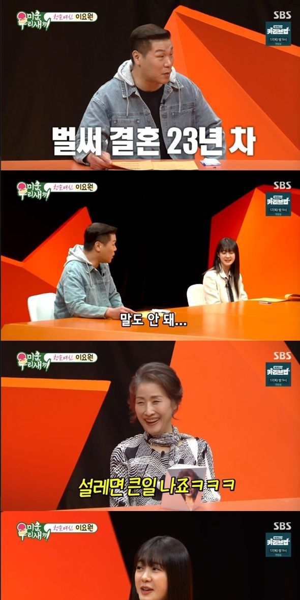 결혼 23년차인 이요원은 남편에게 아직 설레냐는 물음에 "설레면 큰일 난다. 그러면 아픈 거다"라고 말해 웃음을 자아냈다.