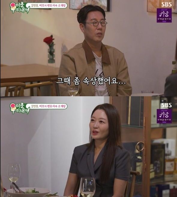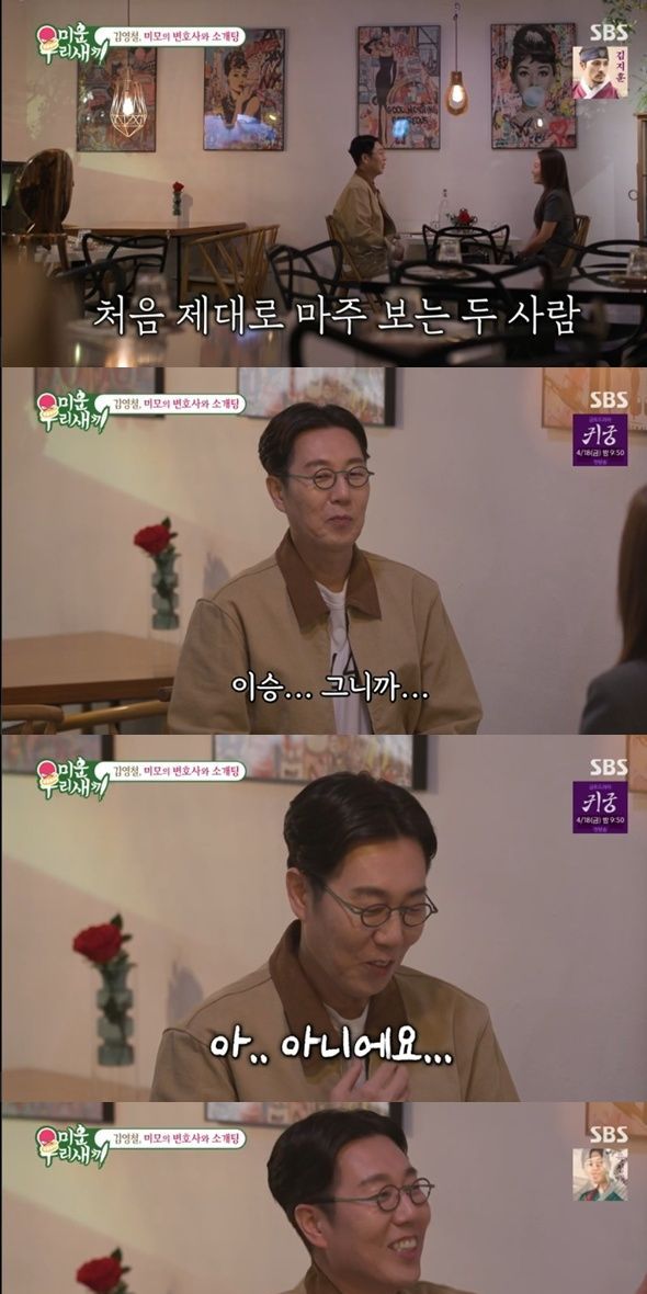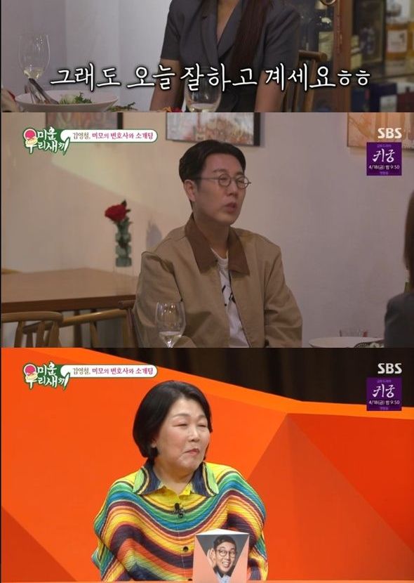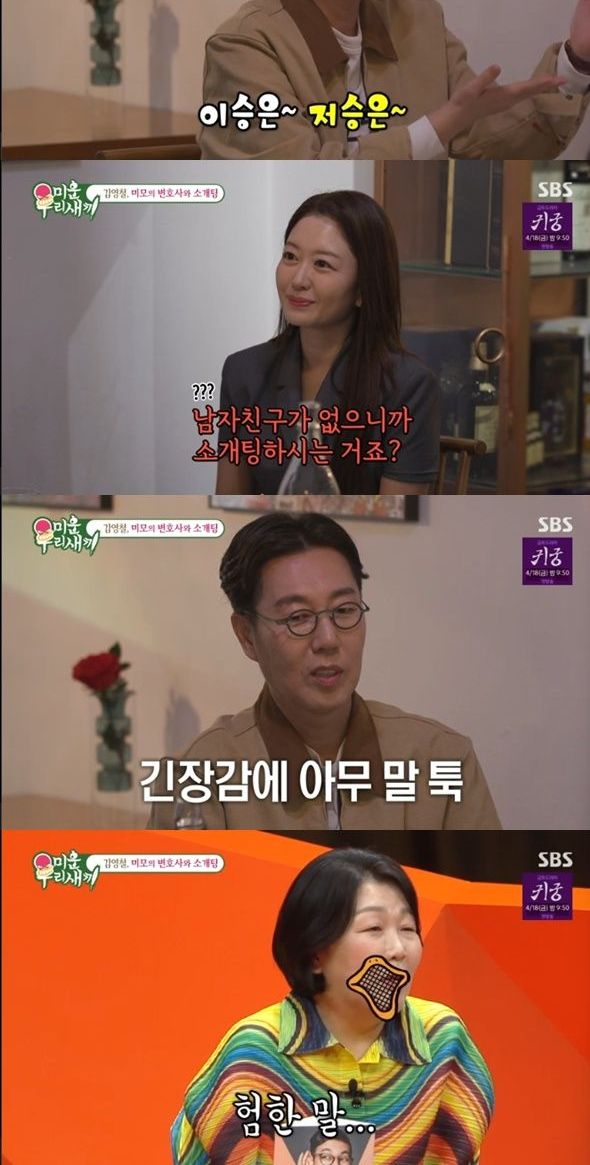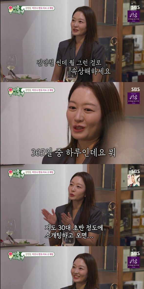 김영철은 "소개팅을 한 지 반년 정도 됐다. 일을 좀 많이 하고 있다. 개업을 하긴 했는데 회사에 소속돼 있는 형식으로 개업했다. 별산 변호사다"라고 했다.