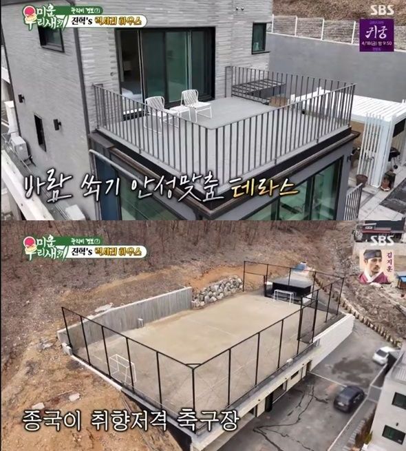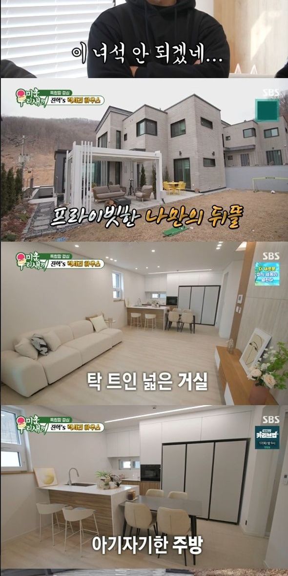 이들은 최진혁이 픽한 광주 숲세권에 위치한 10억 7천의 집을 구경했다. 프라이빗한 뒤뜰이 있으며 거실에는 영화를 보는 스크린도 있었다. 널찍한 미니 축구장도 눈에 띄었다. 탁 트인 넓은 거실과 빌트인 냉장고가 설치된 아기자기한 주방, 테라스도 둘러봤다.
