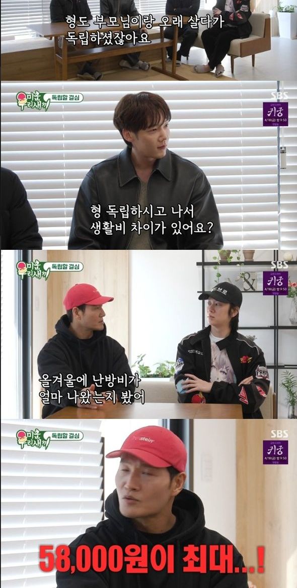 자취 8년차 김종국은 "너네 집 좋은데 무슨 독립을 하냐. 나나 생활비 차이가 없더라. 올 겨울에 난방비가 얼마 나왔는지 봤다. 58000원이 제일 많이 나왔더라. 올겨울이 추워서 틀었는데"라고 이야기해핬다.