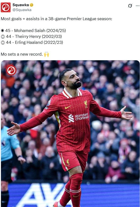 경기 전까지 살라는 아스널 레전드 공격수 티에리 앙리(44개)와 함께 프리미어리그 역대 공격포인트 공동 1위였다. 그러나 웨스트햄전에서 도움을 하나 추가해 공격포인트를 45개로 늘리면서 단독 선두로 올라섰다.