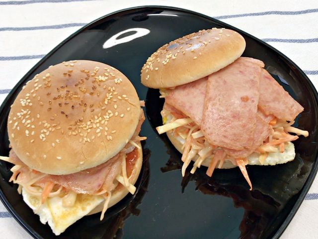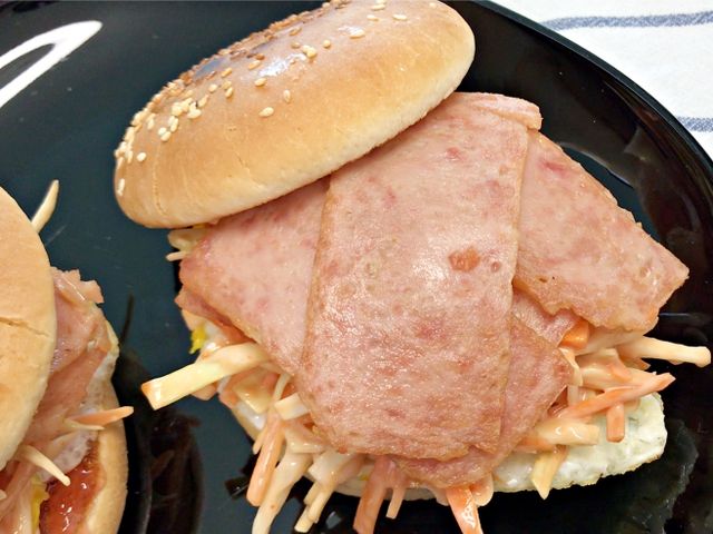 재료는 버거용 빵, 스팸, 계란, 양배추, 당근,