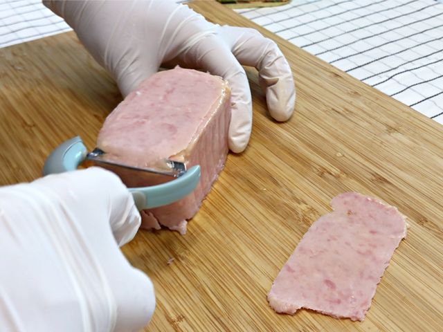 스팸을 필러로 얇게 슬라이스 해주세요.
