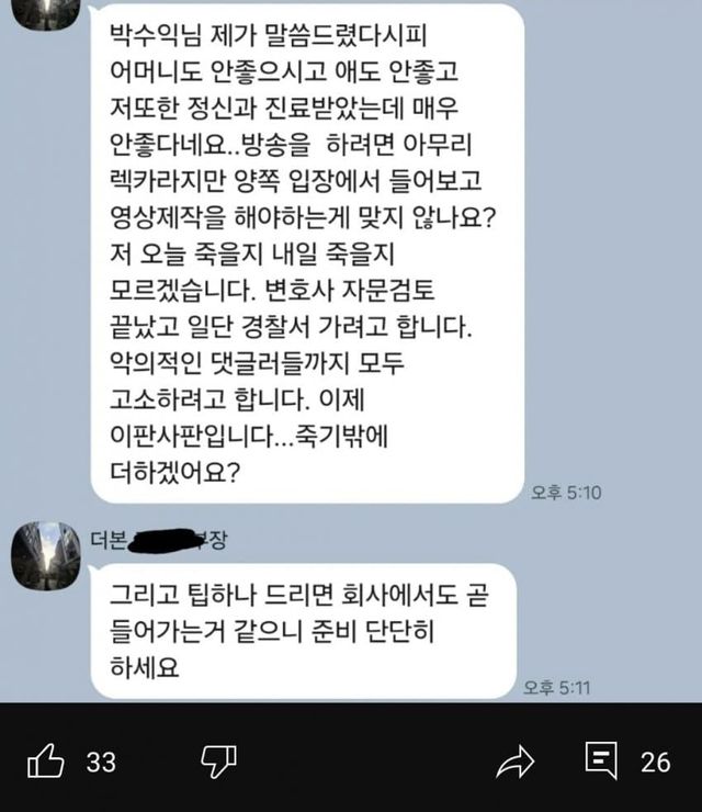 여성과 술집 면접 연루된 부장은 악플러 고소 진행중이라는거고더본 코리아에서는 저 유튜버 고소 준비중이라고 함.