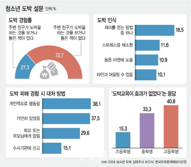 13일 한국도박문제예방치유원이 초등학교 4학년부터 고등학교 3학년 1만 2000명을 대상으로 진행한 ‘2024 청소년 도박 실태조사’ 보고서에 따르면 우리나라 청소년의 4.3%는 도박을 경험한 적이 있다고 답했다. 해당 연령 인구가 약 500만명 수준이라는 점을 고려하면 21만명이 넘는 학생이 도박을 경험했다는 뜻이다. 특히 청소년들이 도박에 대해 ‘재미를 얻는 방법 중 하나’(18.5%), ‘스트레스 해소’(11.6%), ‘용돈 마련에 도움’(10.9%) 등으로 가볍게 인식하고 있는 것으로 나타나 심각성을 더했다.