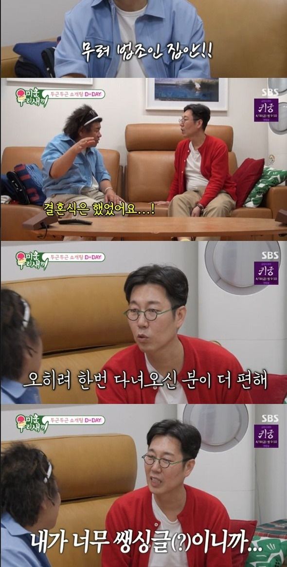 오정태는 "이분이 혼인신고는 안 했는데 결혼식은 했다"라고 알렸다. 김영철은 "난 한 번 갔다온 분이 더 편하다. 이 나이에 한번도 안간 내가 미안할 정도다"라며 반색했다. 김영철 누나도 "괜찮다. 두번인들 어떠냐"라며 호응했다.