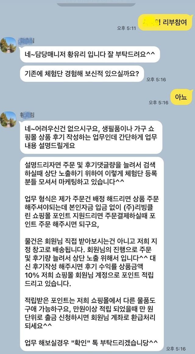 평소 쿠팡에서 쇼핑을 하면서 ‘쿠팡체험단 이벤트로 상품을 무료로 제공받아 작성한 구매 후기입니다’는 상품 리뷰글을 익히 봐왔던 터였다. 참여 의사를 밝히자 기다렸다는 듯 다음 절차를 소개했다. 담당자를 연결해 준다면서 카카오톡 아이디를 불러주고, 곧바로 등록을 유도했다. 이어 또 다른 매니저가 지시사항을 안내했다. 그다음부터는 담당자가 알려준 링크로 들어가 가입만 하면 됐다.