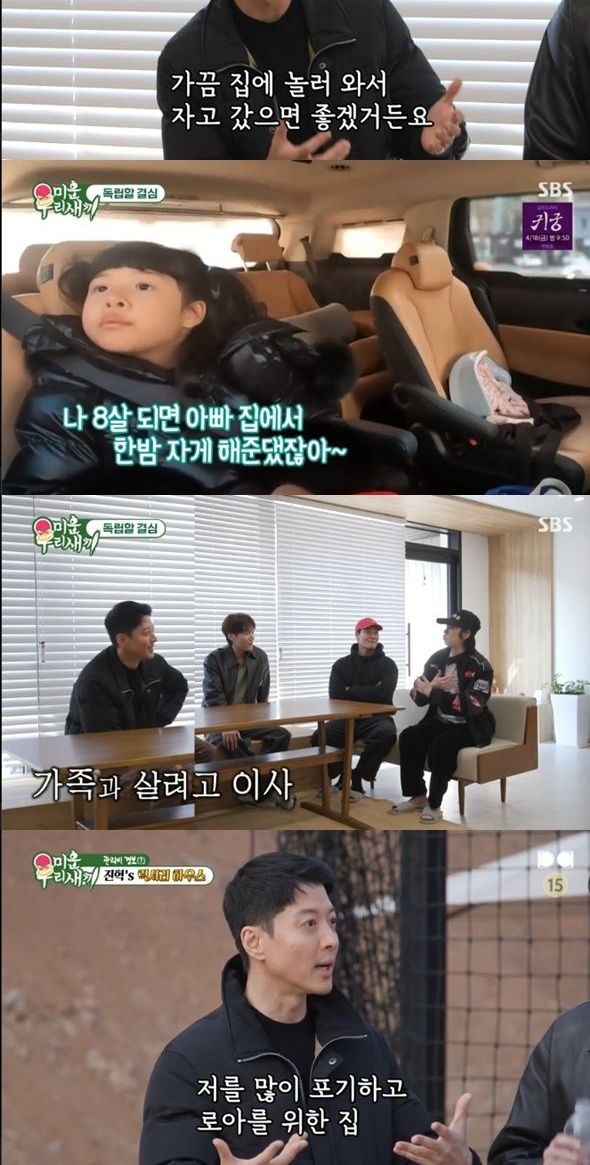 이어 이동건은 "날 많이 포기하고 로아를 위한 집이다. 이 집을 지은 분이 목수다. 자녀들과 같이 스케치하고 구상한 집이다. 정말 아이들을 위해 살집을 지은 거다"라며 자신이 봐둔 복층 단독주택으로 멤버들을 이끌었다.