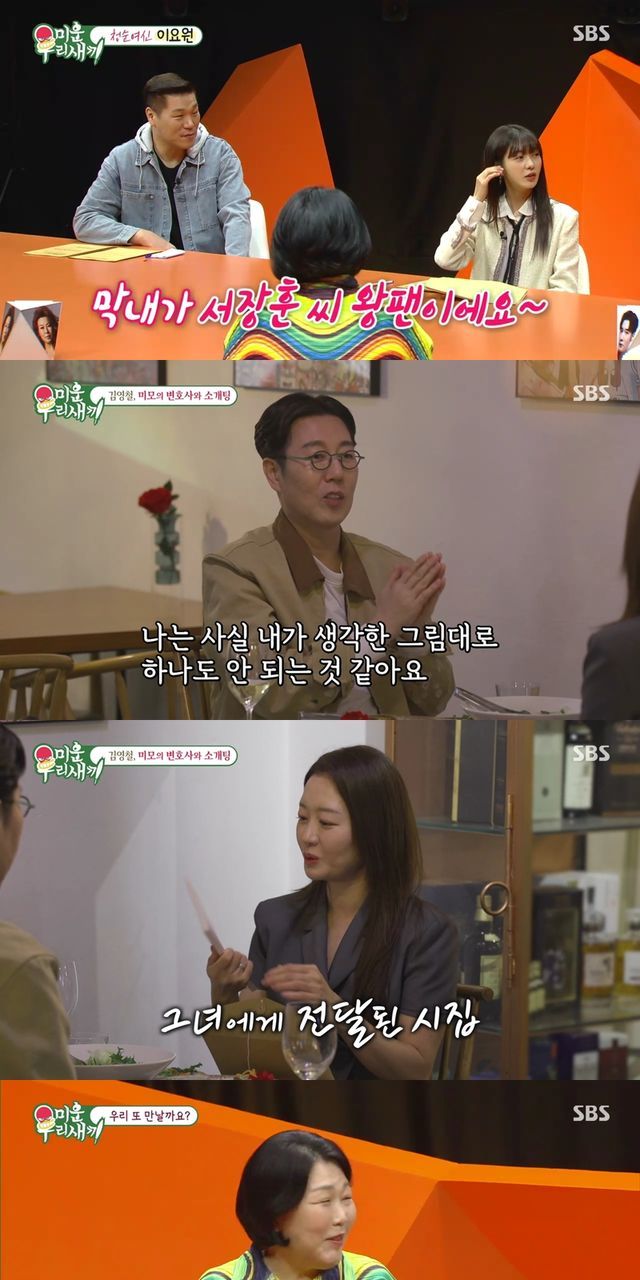 이어 '미우새' 김영철의 설렘 가득한 소개팅이 공개됐다. 변호사에 로스쿨 교수라는 소개팅 상대 스펙이 밝혀지자 스튜디오에 있던 김영철 누나는 "우리 영철이가 너무 딸린다"라며 걱정을 내비쳤다. 소개팅 상태가 짧게 결혼 생활을 한 적 있다는 오정태의 설명에 김영철은 "나는 이 나이에 쌩싱글인 내가 더 미안하다"라며 전혀 상관없다고 말했다.