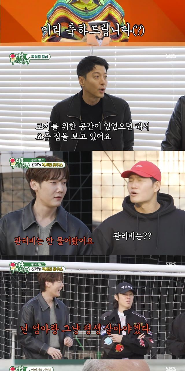 한편 진혁의 로망 하우스르를 보러 간 네 사람. 통창 로망을 뽐내는 최진혁의 옆에서 김종국은 "전기세 난방비 확인 안 했냐"라며 잔소리를 시작했다. 대출이나 이자에 대해서는 전혀 모르겠다는 최진혁에게 김희철은 "너는 그냥 엄마랑 평생 살아야겠다"라며 고개를 내저었다.