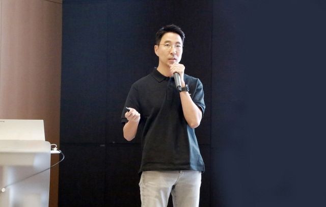 김민표 두산로보틱스 대표가 전 임직원들이 모인 타운홀 미팅 자리에서 회사의 방향성과 비전에 대해 공유하고 있다. ⓒ 두산로보틱스