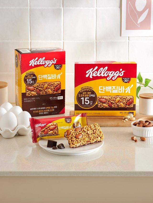 신제품 '단백질바K'는 제품 1개(50g)당 단백질 15g을 함유해, 하루 단백질 권장량의 약 27%를 채울 수 있다. 이는 삶은 계란 약 2.5개, 닭가슴살 54g, 우유 490㎖에 해당하는 수준으로, 아침 식사 대용은 물론 운동 전후, 바쁜 일상 속 단백질 보충 간식으로 적합하다. 기존 켈로그 단백질바 대비 10g 증량된 50g으로 출시돼 더욱 포만감 있게 즐길 수 있다.