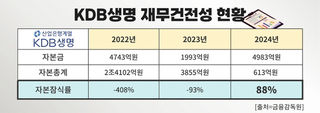 지난해 KDB생명의 자본잠식률은 무려 87.7%로 재무건전성이 크게 훼손된 상태다. 금융감독원이 권고하는 지급여력비율은 최소 150% 이상이지만 지난해 말 KDB생명의 킥스 비율은 52.3%로 전체 생명보험사 가운데 최하위권이다. 한시적으로 금융당국으로부터 경과조치를 적용받고 있지만 향후 대규모 자본 확충이 불가피한 상황이다. 인수 후보자들에게 부담으로 작용하면서 매각 실패의 주된 원인으로 꼽힌다.