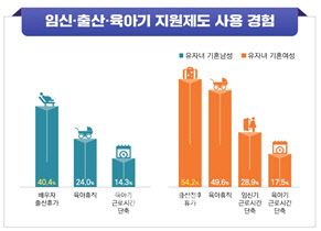 기혼남녀 모두 육아휴직 사용 기간 ‘1년 이상(남성 43%, 여성 37.9%)’을 가장 선호했다. 이들 모두 ‘영유아 돌봄 시기 유연근무제 사용을 희망(여성 94.5%, 남성 90.8%) 한다’고 응답했다. 이들은 ‘재택근무’(남성 35.1%, 여성 29.4%)와 ‘시간 선택제’(남성 33.6%, 여성 39.2%)를 선호했다. 특히 여성은 ‘시간선택제’를 더 선호하는 것으로 나타났다.