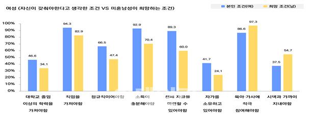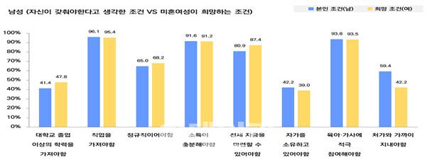 미혼여성이 희망하는 남성의 조건은 △직업을 가져야 한다(95.4%) △육아·가사에 적극 참여해야 한다(93.5%) △소득이 충분해야 한다(91.2%) 등을 복수로 꼽았다. 반면, 미혼남성이 희망하는 여성의 조건은 △육아·가사에 적극 참여해야 한다(97.3%) △직업을 가져야 한다(82.9%) △소득이 충분해야 한다(70.4%) 등이었다.