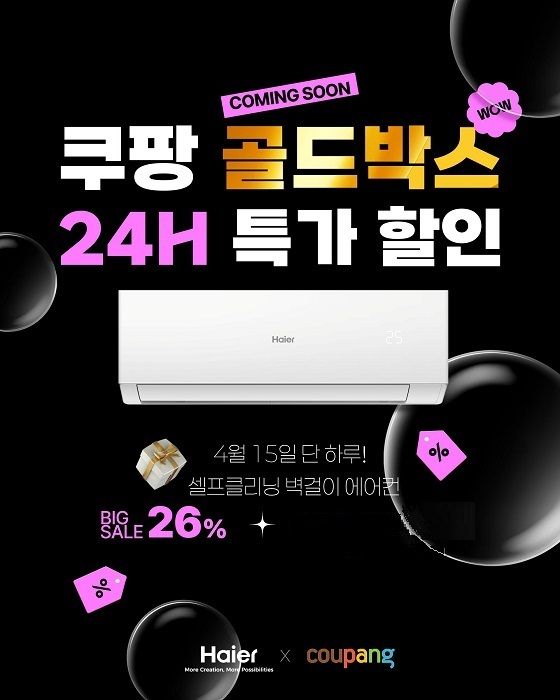 글로벌 가전업체 하이얼(Haier)이 오는 15일 하루 동안 쿠팡 골드박스를 통해 8평형 벽걸이형 에어컨 할인행사를 진행한다.