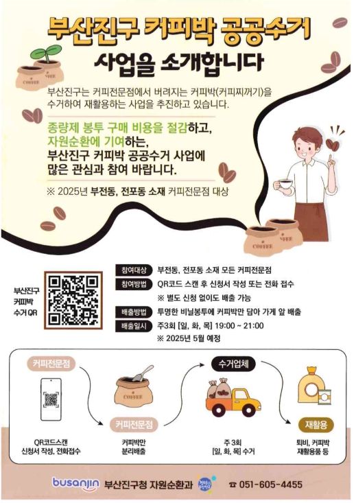 [파이낸셜경제=김영란 기자] 부산 부산진구는 5월부터 부산의 대표 번화가인 부전동과 전포동의 커피전문점을 대상으로 커피박을 공공수거하는 사업을 시작한다고 밝혔다.