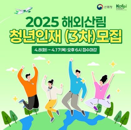 또한 해외산림청년인재 육성사업의 참가자 3차 모집도 진행한다. 청년 산림 인재에게 해외산림 현장에서 실무를 경험할 수 있는 기회를 제공함으로써, 해외 진출 기반을 마련하고 글로벌 산림 전문가로의 성장을 지원하는 사업이다. 해당 사업은 4월 17일까지 신청 가능하다.